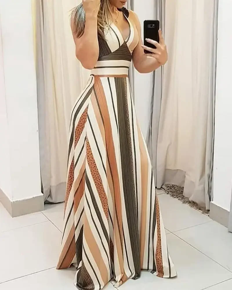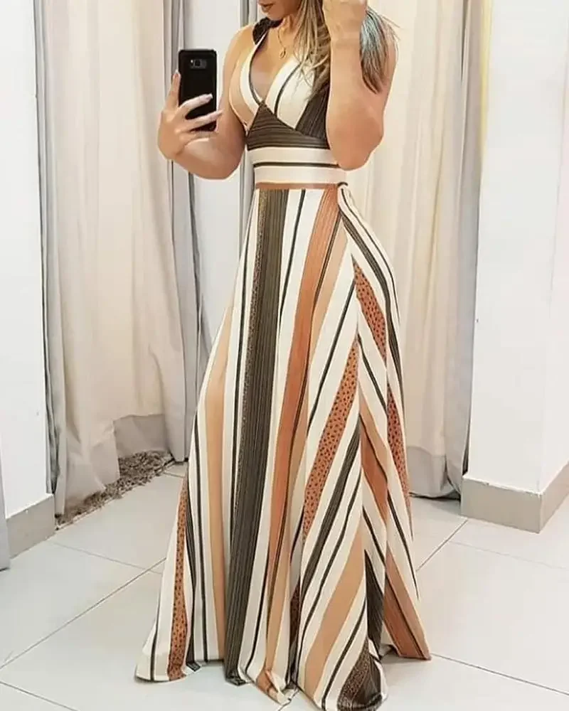 Women Fashion Dress 2024 Spring/summer Latest European American Leisure Commuter Sleeveles Stripe Printed Color Block Long Dress